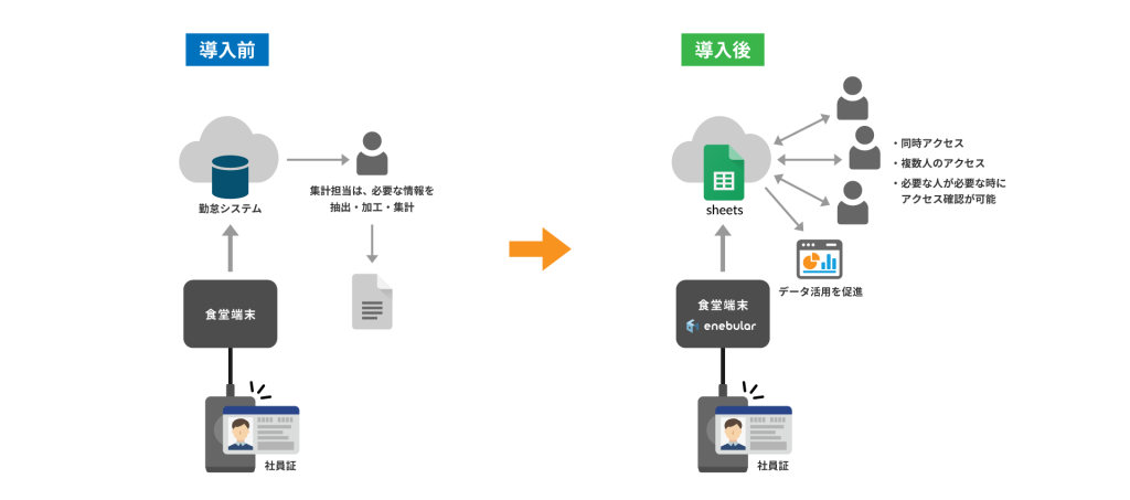 - 社員が食堂入口で社員証を非接触ICカードリーダーにかざす